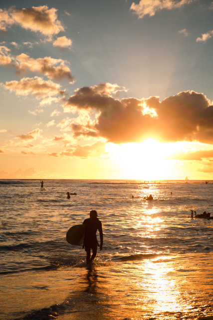 Surfers enjoying the golden sunset.
