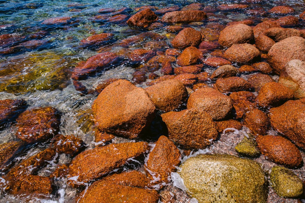 The pebbles glisten under the receding wave.