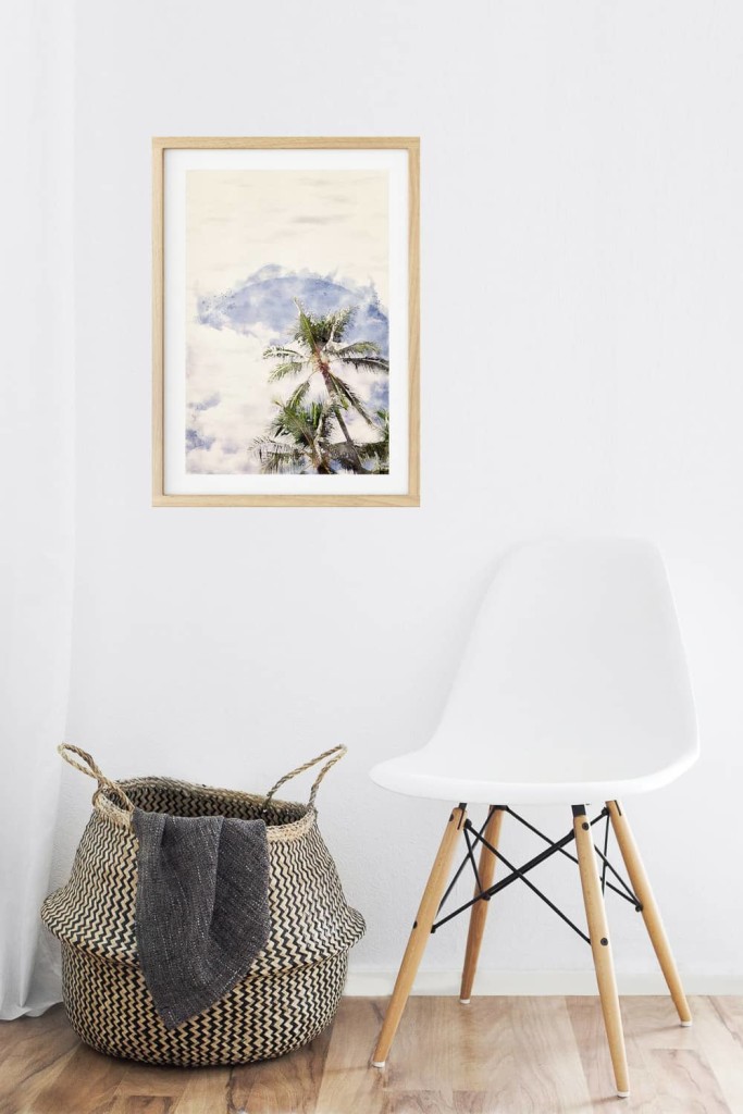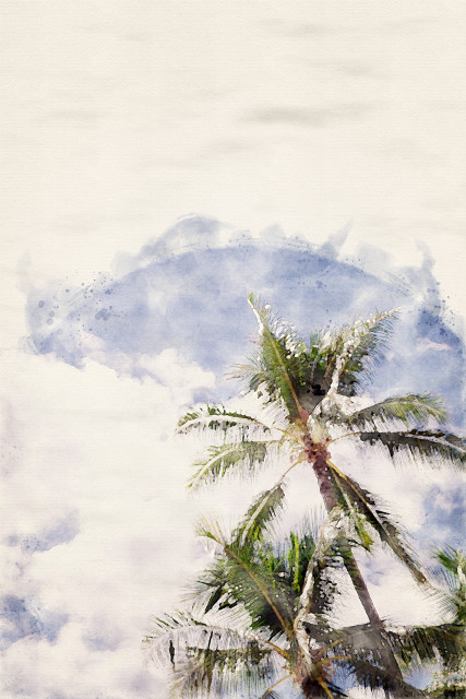 The beauty of scattered clouds and coconut trees in a watercolour frame.
