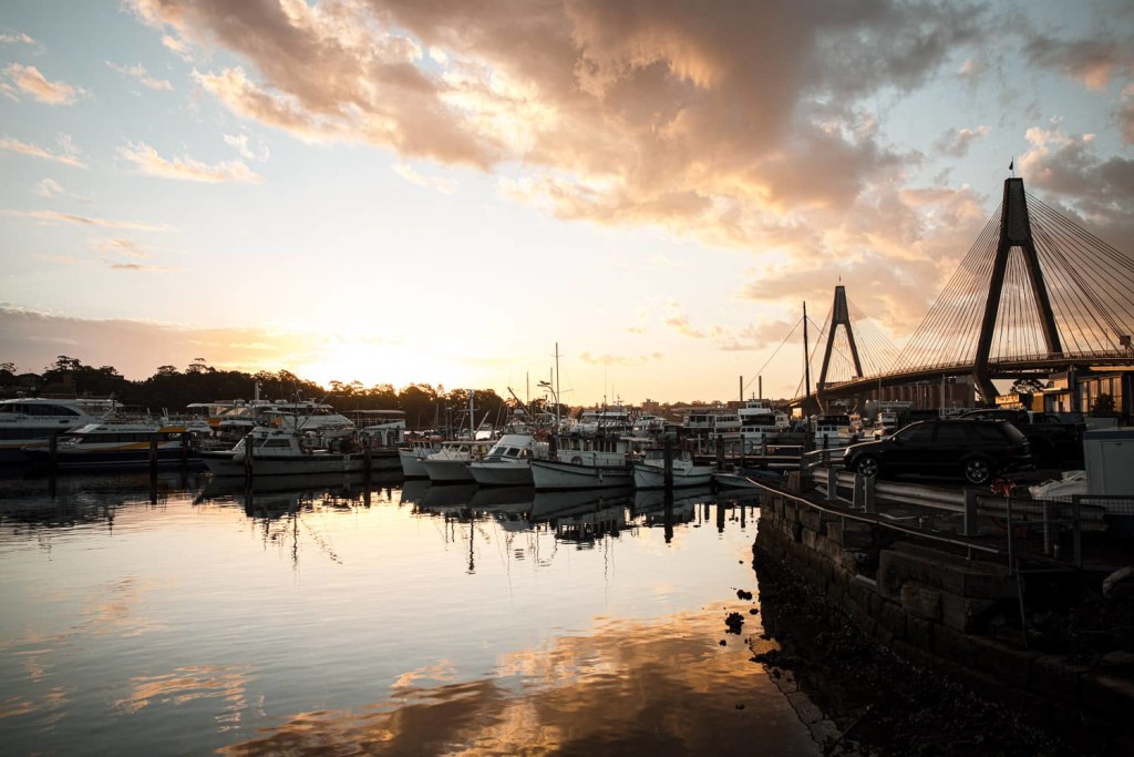 Sunset over Anzac Bridge in Sydney.