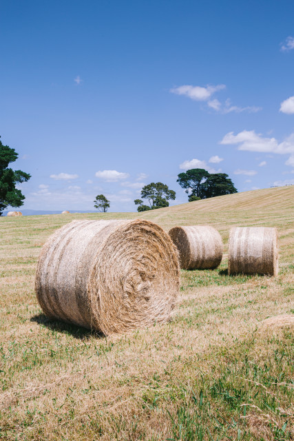 Bales of hay under a blue sky.