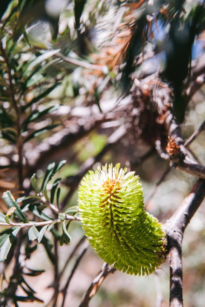 A yellow Banksia (Coast Banksia) nestled amongst the twigs.